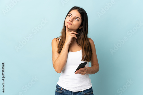 Young caucasian woman using mobile phone isolated on blue background having doubts while looking up