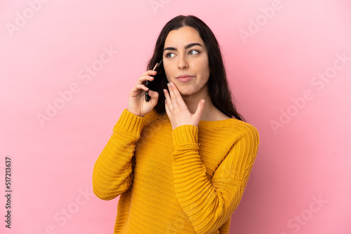 Young caucasian woman using mobile phone isolated on pink background looking up while smiling