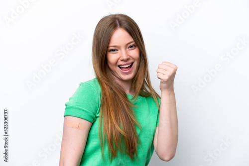 Young caucasian woman wearing a band aids isolated on white background celebrating a victory