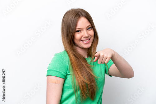 Young caucasian woman wearing a band aids isolated on white background points finger at you with a confident expression