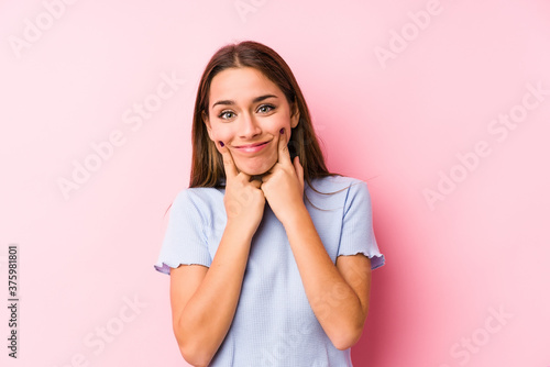 Young caucasian woman wearing a ski clothes isolated doubting between two options.