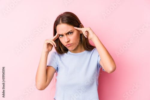 Young caucasian woman wearing a ski clothes isolated focused on a task, keeping forefingers pointing head.