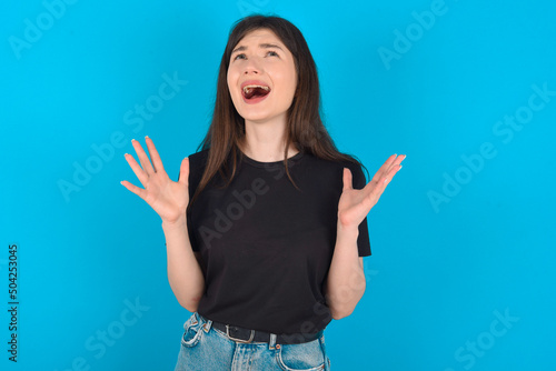 young caucasian woman wearing black T-shirt over blue background crying and screaming. Human emotions, facial expression concept. Screaming, hate, rage.