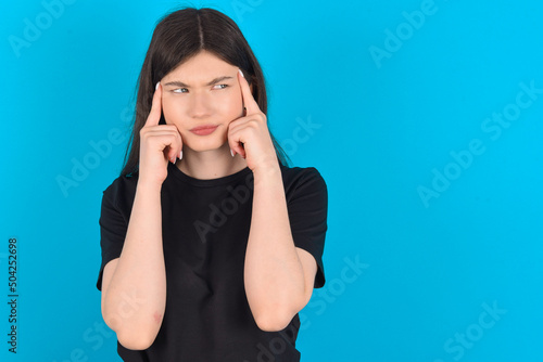 young caucasian woman wearing black T-shirt over blue background with thoughtful expression, looks away, keeps hand near face, thinks about something pleasant.