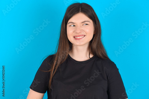 young caucasian woman wearing black T-shirt over blue background with thoughtful expression, looks away keeps hands down bitting his lip thinks about something pleasant.