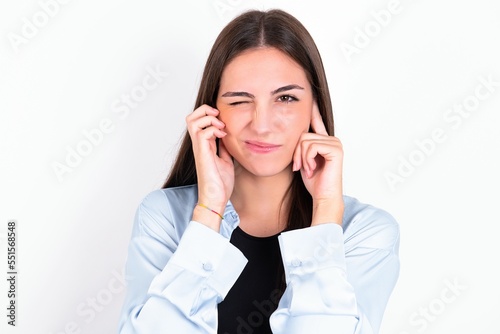 Young caucasian woman wearing blue overshirt over white background covering ears with fingers with annoyed expression for the noise of loud music. Deaf concept.