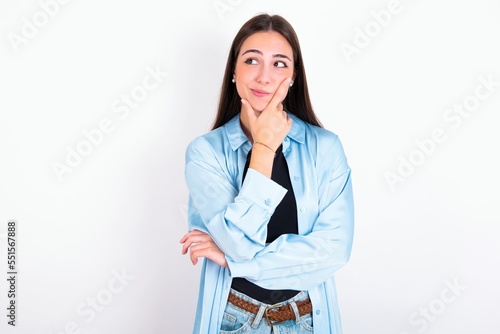 Young caucasian woman wearing blue overshirt over white background Thinking worried about a question, concerned and nervous with hand on chin.