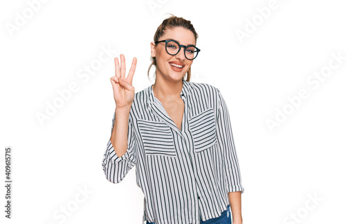 Young caucasian woman wearing business shirt and glasses showing and pointing up with fingers number three while smiling confident and happy.