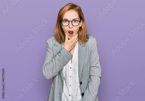 Young caucasian woman wearing business style and glasses looking fascinated with disbelief, surprise and amazed expression with hands on chin