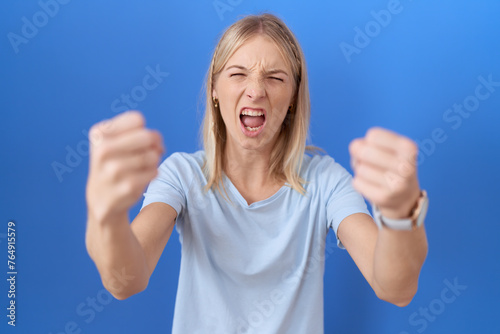 Young caucasian woman wearing casual blue t shirt angry and mad raising fists frustrated and furious while shouting with anger. rage and aggressive concept.
