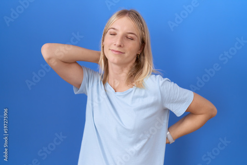Young caucasian woman wearing casual blue t shirt suffering of neck ache injury, touching neck with hand, muscular pain