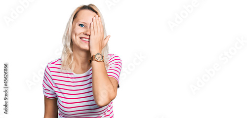 Young caucasian woman wearing casual clothes covering one eye with hand, confident smile on face and surprise emotion.