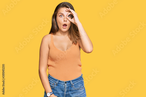 Young caucasian woman wearing casual clothes doing ok gesture shocked with surprised face, eye looking through fingers. unbelieving expression.