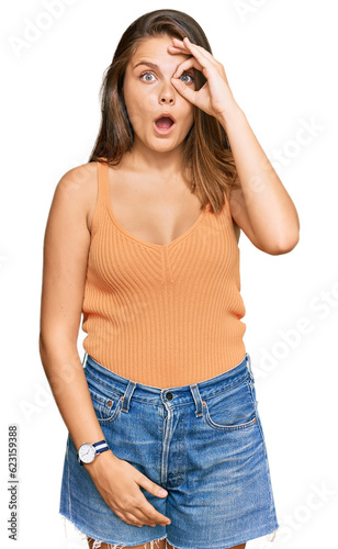 Young caucasian woman wearing casual clothes doing ok gesture shocked with surprised face, eye looking through fingers. unbelieving expression.