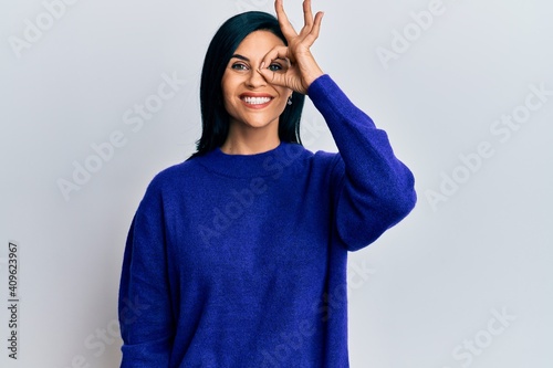 Young caucasian woman wearing casual clothes doing ok gesture with hand smiling, eye looking through fingers with happy face.