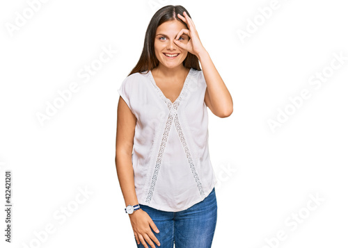 Young caucasian woman wearing casual clothes doing ok gesture with hand smiling, eye looking through fingers with happy face.