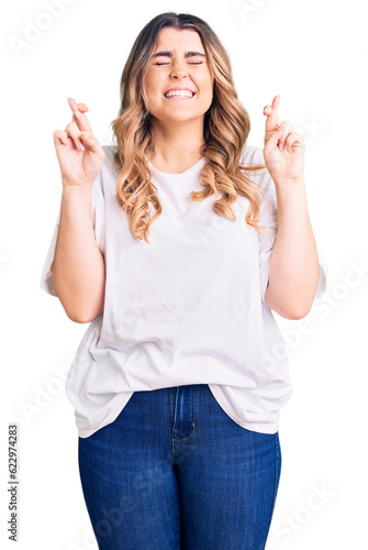 Young caucasian woman wearing casual clothes gesturing finger crossed smiling with hope and eyes closed. luck and superstitious concept.