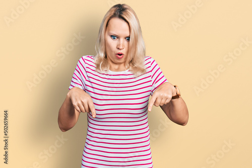 Young caucasian woman wearing casual clothes pointing down with fingers showing advertisement, surprised face and open mouth