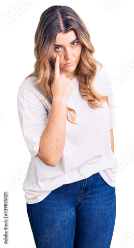 Young caucasian woman wearing casual clothes pointing to the eye watching you gesture, suspicious expression