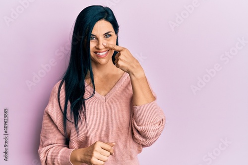 Young caucasian woman wearing casual clothes pointing with hand finger to face and nose, smiling cheerful. beauty concept