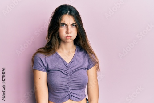 Young caucasian woman wearing casual clothes puffing cheeks with funny face. mouth inflated with air, crazy expression.