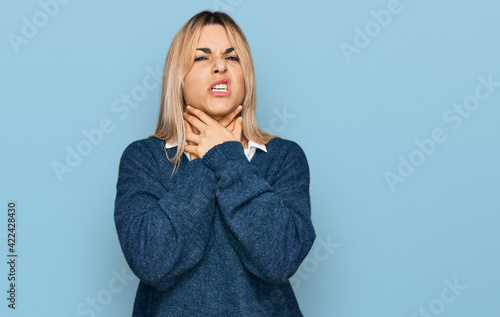 Young caucasian woman wearing casual clothes shouting suffocate because painful strangle. health problem. asphyxiate and suicide concept.