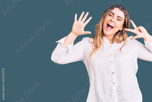 Young caucasian woman wearing casual clothes showing and pointing up with fingers number eight while smiling confident and happy.