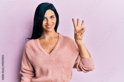 Young caucasian woman wearing casual clothes showing and pointing up with fingers number three while smiling confident and happy.