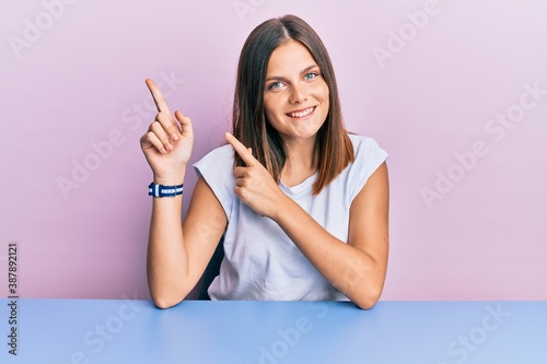 Young caucasian woman wearing casual clothes sitting on the table smiling and looking at the camera pointing with two hands and fingers to the side.