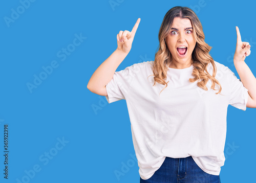 Young caucasian woman wearing casual clothes smiling amazed and surprised and pointing up with fingers and raised arms.