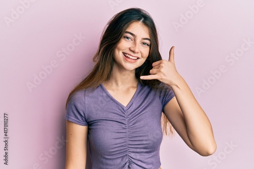 Young caucasian woman wearing casual clothes smiling doing phone gesture with hand and fingers like talking on the telephone. communicating concepts.