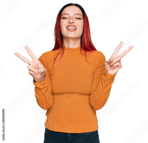 Young caucasian woman wearing casual clothes smiling looking to the camera showing fingers doing victory sign. number two.