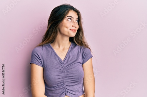 Young caucasian woman wearing casual clothes smiling looking to the side and staring away thinking.