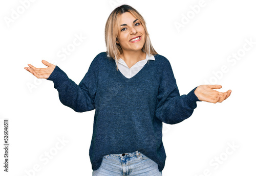 Young caucasian woman wearing casual clothes smiling showing both hands open palms, presenting and advertising comparison and balance