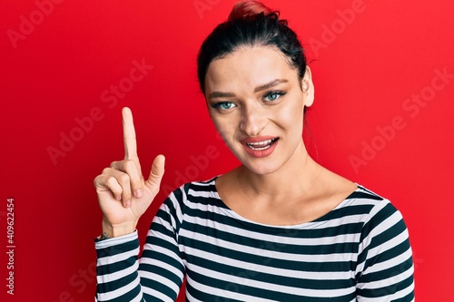 Young caucasian woman wearing casual clothes smiling with an idea or question pointing finger up with happy face, number one
