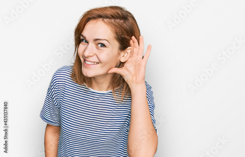 Young caucasian woman wearing casual clothes smiling with hand over ear listening an hearing to rumor or gossip. deafness concept.