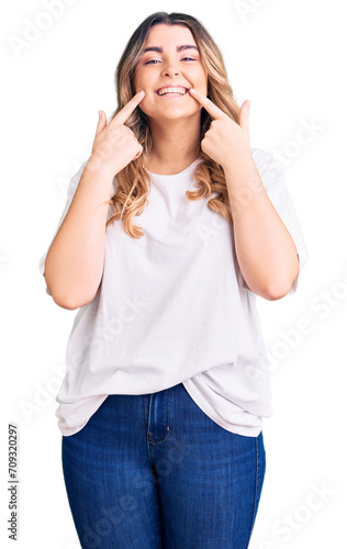 Young caucasian woman wearing casual clothes smiling with open mouth, fingers pointing and forcing cheerful smile