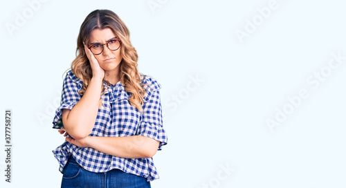 Young caucasian woman wearing casual clothes thinking looking tired and bored with depression problems with crossed arms.