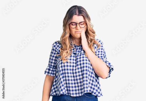 Young caucasian woman wearing casual clothes touching mouth with hand with painful expression because of toothache or dental illness on teeth. dentist