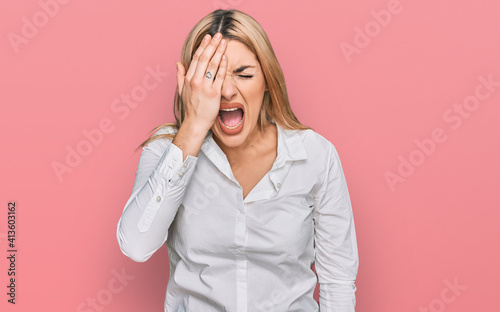 Young caucasian woman wearing casual clothes yawning tired covering half face, eye and mouth with hand. face hurts in pain.