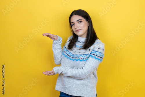 Young caucasian woman wearing casual sweater over yellow background gesturing with hands showing big and large size sign, measure symbol. Smiling . Measuring concept.