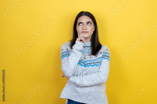Young caucasian woman wearing casual sweater over yellow background serious face thinking about question with hand on chin, thoughtful about confusing idea