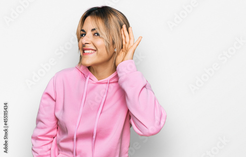 Young caucasian woman wearing casual sweatshirt smiling with hand over ear listening an hearing to rumor or gossip. deafness concept.