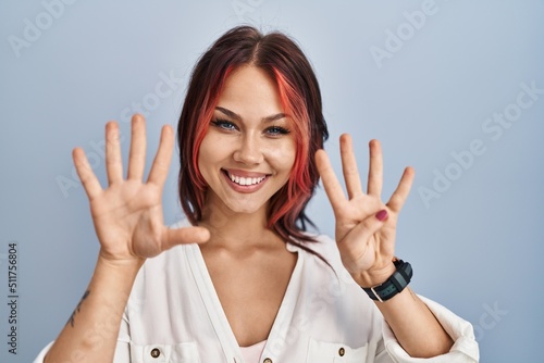 Young caucasian woman wearing casual white shirt over isolated background showing and pointing up with fingers number nine while smiling confident and happy.