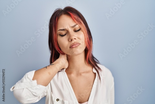 Young caucasian woman wearing casual white shirt over isolated background suffering of neck ache injury, touching neck with hand, muscular pain