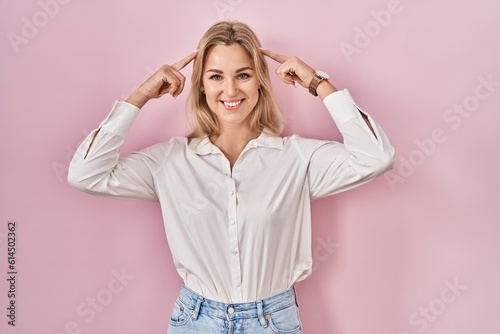 Young caucasian woman wearing casual white shirt over pink background smiling pointing to head with both hands finger, great idea or thought, good memory