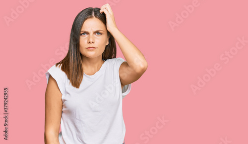 Young caucasian woman wearing casual white tshirt confuse and wonder about question. uncertain with doubt, thinking with hand on head. pensive concept.