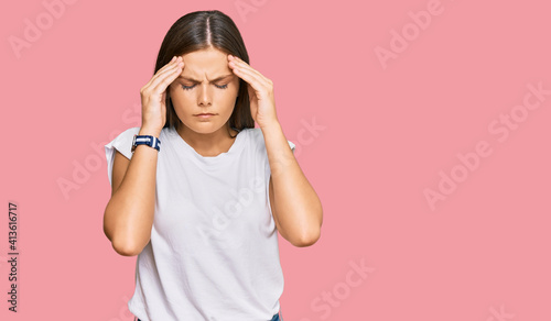 Young caucasian woman wearing casual white tshirt with hand on head for pain in head because stress. suffering migraine.