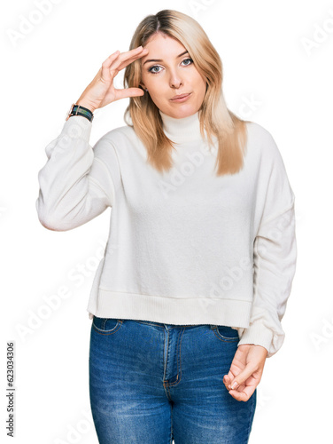 Young caucasian woman wearing casual winter sweater worried and stressed about a problem with hand on forehead, nervous and anxious for crisis