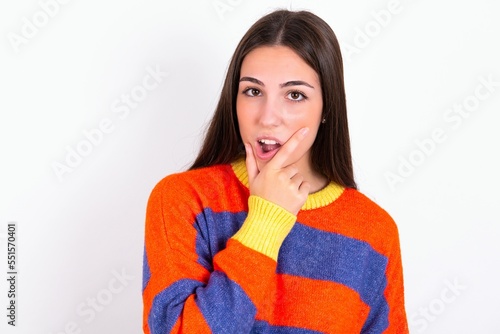 Young caucasian woman wearing colorful knitted sweater over white background Looking fascinated with disbelief, surprise and amazed expression with hands on chin